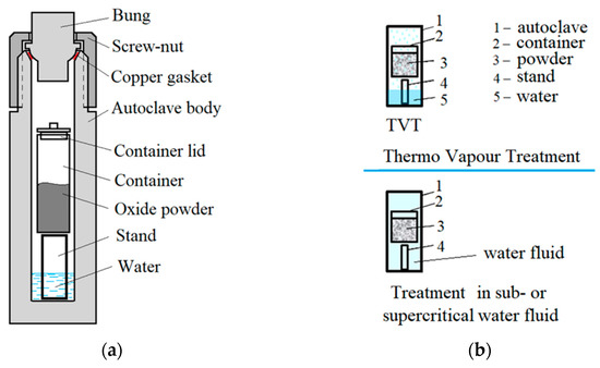 Additional information about the processes occurring in the interaction of simple and complex oxides with the water medium is provided by studies of transformations under hydrothermal or thermo-vapor conditions of autoclave treatment (TVT). First of all, it should be noted that when processing occurs in a water medium in an autoclave without applying mechanical pressure, a sharp decrease in the temperature of oxide transformations is also observed (Table 1). In studies of the synthesis and changes in the dispersion of simple and complex oxides in water vapor, as well as in the medium of sub- and supercritical water fluid [17,18,19], ideas have been formed about the mechanisms of the processes that can be used to interpret the effect of mechanical pressure on the mass transfer processes during cold sintering.
