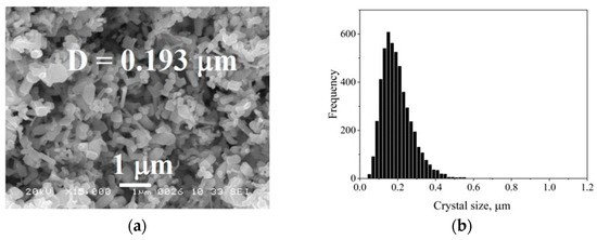 Characteristics of the initial ZnO powder: (a) SEM micrograph (Reprinted from Ref. [33], copyright (2019), with the kind permission of Springer Nature.); (b) crystal size distribution.