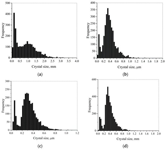 Analysis of the grain and crystal size distribution (Figure 6) shows that the close characteristics of the selected fine-dispersed component of the grain distribution of CSP samples and crystals of TVT samples indicate a similar mechanism of its formation. The presence of fine components of the crystal size distribution after TVT and grains after CSP may indicate a slight influence of the dissolution-precipitation mechanism on the processes under consideration. Since, otherwise, the proportion of fine components should not only increase compared to the original fine-crystalline powder (Figure 3) but, on the contrary, should decrease.