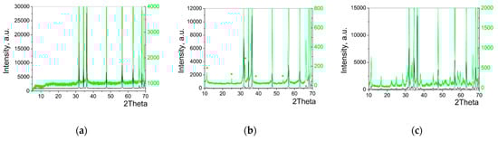 X-ray patterns of samples: (a) CSP1; (b) CSP4; (c) TVT4: black—full spectrum; green—the spectrum is shown with increased sensitivity for the low-intensity reflexes detection; green dots—reflexes of unidentified phase.