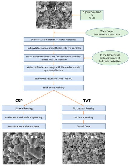 Under TVT conditions in the absence of mechanical pressure, the crystal size increases slightly with growth due to the surface spreading of the mass of mobile crystals. When adding mechanical pressure to CSP, under similar conditions, the probability of coalescence of crystals with solid-phase mobility of the structure increases. In this case, both a faster growth of crystalline grains and their compaction with forming a microstructure characteristic of ZnO ceramics are observed. A summary of the results of a comparative study of CSP and TVT of a fine-crystalline ZnO powder with zinc acetate and ammonium chloride additives previously applied to the surface is schematically presented in Figure 8.