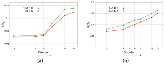 The dependence of aspect ratios (a) and (b) of superconducting domains in (TMTSF)ClO on disorder at two temperatures K and K, calculated using Equations (4), (9) and (10) and resistivity data from Figure 3 and 4 of Ref. [6], taken at cooling rate 600 K/min and various annealing times. At longer annealing time, i.e., at weaker disorder, the shape of SC domains is more anisotropic.