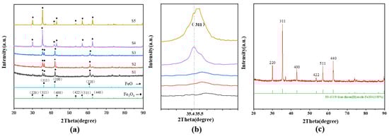 The (311) diffraction peaks corresponding to the FeO/Fe3O4 mixture S1, S2, and S3 shifted to a higher 2θ (Figure 1b), indicating that at the mixing ratio of 1:0.5 ferric nitrate and citric acid, the doping of FeO content increases. Additionally, when the FeO content is large, it can be seen from the interlayer spacing of Fe3O4 that the Fe3O4 diffraction peak intensity is not sharp enough.