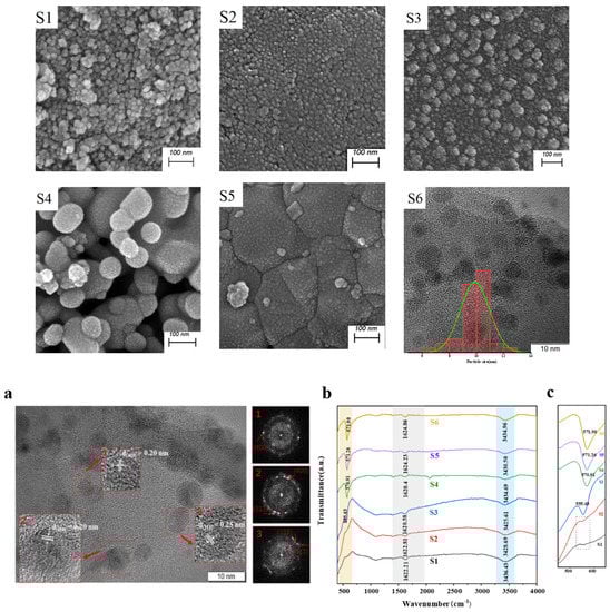 When the molar ratio of ferric nitrate to citric acid is 1:0.8 mol, it can be observed that the main phase of samples S4 and S5 is Fe3O4, with a trace amount of FeO. On this basis, without changing the ratio of raw materials, the FeO content is reduced by adjusting the temperature. When the reaction temperature reaches 650 °C, there is only a single phase of Fe3O4 in the product without other peaks (Figure 1c). The strong and sharp diffraction peaks indicate that the sample has good crystallinity. The XRD pattern can be matched to the series of Bragg reflections corresponding to the standard phase of the spinel structure of Fe3O4. Six peaks at 30.16°, 35.49°, 43.01°, 53.78°, 57.21°, and 62.73° can be indexed as (220), (311), (400), (422), (511), and (440) of the cubic structure of Fe3O4 nanoparticles.