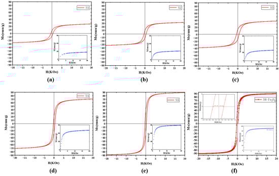 (a–f) Magnetization vs. magnetic field plots of S1–S6 samples at 300 K.