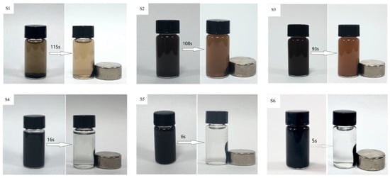 Dispersion degree of the samples (S1–S6) in ethanol solution and the magnetic response time of the samples after applied magnetic field were studied.