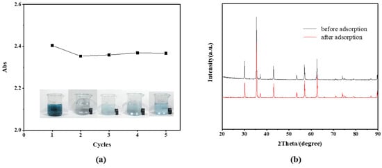 The recyclability of Fe3O4 as an adsorbent is a common issue that deserves investigation in the pursuit of practical applications. In the recycling experiments, the Fe3O4 which adsorbed MB is separated from the solution with an external magnet, and then is re-dispersed into acidic methanol solution. After proper ultrasonic cleaning, Fe3O4 will be re-collected and dried for reuse to adsorb MB again. This process is repeated four times. As shown in Figure 6a, Fe3O4 magnetic powder after repeated use still retains its magnetic properties in aqueous solution. After detecting the absorbance of the supernatant after adsorption, it is concluded that Fe3O4 can adsorb MB many times, and the adsorption capacity is basically unchanged. It shows that the structure and magnetic properties of Fe3O4 are stable and that it could be reused.