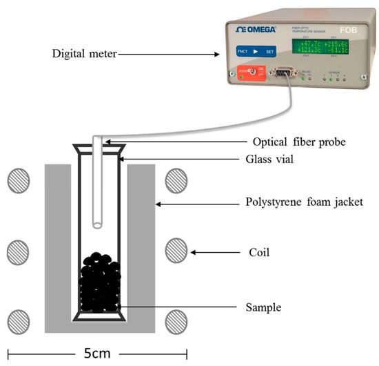 The powder samples were contained in a glass vial in a polystyrene foam jacket inserted axially in the working coil, as shown in Figure 1. The temperature was measured using an optical fiber probe (FOBS-2) connected to a digital meter (OMEGA-FOB101).