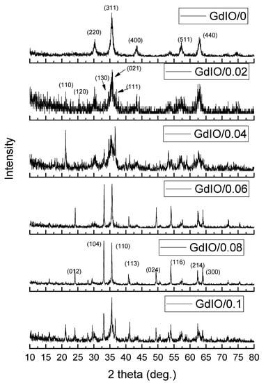 X-ray diffraction pattern for samples GdIO/0, GdIO/0.02, GdIO/0.04, GdIO/0.06, GdIO/0.08 and GdIO/0.1 arranged from top to bottom.