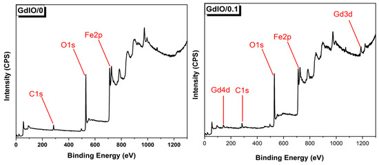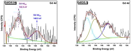 The main peak for O2− in sample GdIO/0 is represented in Figure 4b. It occurs at 530.08 eV [32,55]. The peak is deconvoluted and indexed according to Zhang et al. [56]. It is produced by the oxygen incorporated into the lattice, oxygen in the dangling bonds at the surface of the particles and the adsorbed oxygen. Gadolinium was detected using XPS spectroscopy for samples GdIO/0.04, GdIO/0.06, GdIO/0.08 and GdIO/0.1. Figure 5 is a high-resolution plot for the peaks of in samples GdIO/0.04 and GdIO/0.1. The high energy peak (Gd 3d5/2) is observed at 1185.6 eV for sample GdIO/0.04, and the low energy peak (Gd 4d p) appears at 142.5 and 148.5 eV for Gd 4d5/2 and Gd 4d3/2, respectively. Correlating this result with the performed phase analysis verifies that gadolinium exists as for samples GdIO/0.06, GdIO/0.08 and GdIO/0.1. The gadolinium content detected for sample GdIO/0.04 proved not to form or else it would otherwise have been detected using XRD. This implies that it could have been incorporated into the iron oxide lattice.