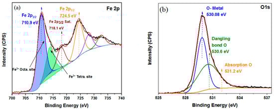 Elemental analysis, oxidation states and cation distribution are determined from XPS analysis. XPS spectra for only two samples (GdIO/0 and GdIO/0.1) are shown in Figure 3, and the significant peaks are indexed. For sample GdIO/0, iron ions in Figure 4a show two 2p peaks due to spin orbit coupling. The high energy peak at 08 eV is the Fe 2p3/2 peak. The low energy main peak for 2p1/2 appeared at 711.14 eV and was deconvoluted into two peaks. The peaks are at 710.79 and 714.08 eV, representing Fe3+ ions occupying the octahedral and tetrahedral sites, respectively. The Fe 2p1/2 peak is accompanied by a satellite peak at 718.1 eV. The presence of the satellite peak implies that the formed phase is maghemite with all the iron content oxidized to Fe3+ ions [53]. For magnetite, the Fe 2p1/2 peak appears at slightly lower energies [54]. This resolves the structural controversy as the results rule out the formation of magnetite due to the lack of evidence for the presence of in any of the compounds. Thus, it verifies that maghemite is the only FCC phase produced in all samples. Calculation of the integral areas corresponding to the occupation of the tetrahedral and octahedral sites revealed that 73.61% of occupies the octahedral site and 26.39% occupies the tetrahedral site with a ratio that is very close to the characteristic ratio for ideal .