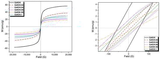 Magnetization curves for samples GdIO/0, GdIO/0.02, GdIO/0.04, GdIO/0.06, GdIO/0.08 and GdIO/0.1 (left) and magnetization for the small applied field to show the coercivity of samples (right).