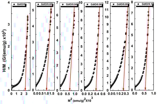 To obtain more accurate magnetization values, Arrott plots (H/M versus M2 curve) were plotted to analyze the magnetic behavior for all investigated samples, which are shown in Figure 7. From the Arrott plots, Ms was determined through the linear extrapolation of the high field magnetization data, which is indicated by the dashed lines [63]. The obtained Ms values from the Arrott plots are listed in Table 2, along with the measured magnetization values and coercivities for all samples.