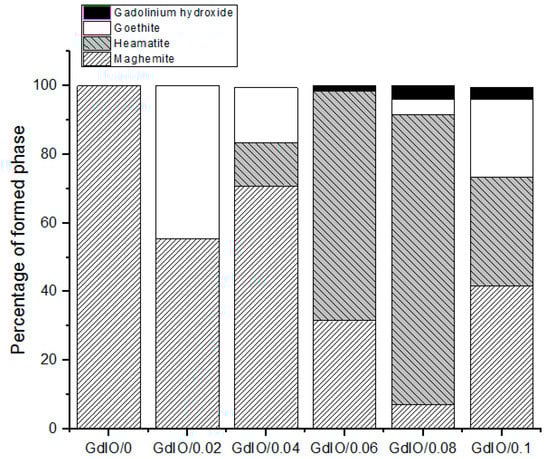 The percentages of the various phases in samples GdIO/0, GdIO/0.02, GdIO/0.04, GdIO/0.6, GdIO/0.8 and GdIO/0.1 from left to right. The patterned bars represent the magnetic phases.