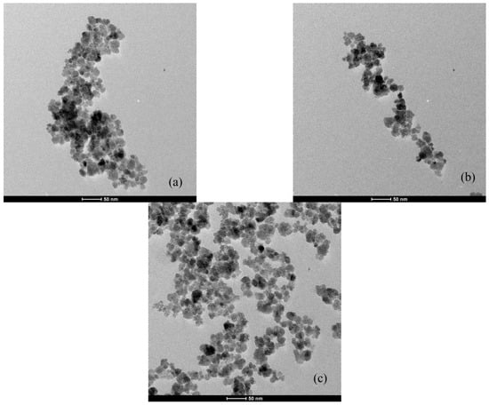 TEM micrographs of the samples GdIO/0, GdIO/0.02, and GdIO/0.04 are shown in Figure 9. The micrographs show that all three samples are formed of almost spherical particles and no considerable variation in size among samples is observed. The calculated average sizes of samples GdIO/0, GdIO/0.02, and GdIO/0.04 are 13.6 ± 1.2 nm, 12.8 ± 1.4 nm and 13.9 ± 1.6 nm, respectively.