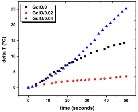 In this section, SAR values will be determined only for the maghemite sample GdIO/0 and the two samples with gadolinium ions incorporated into the iron oxide lattice, namely GdIO/0.02 and GdIO/0.04. The exposure frequency was 198 kHz, and the field intensity was 9.27 kA/m. The temperature rise versus exposure time (50 s) for the three samples is depicted in Figure 10. SAR values are determined from Equation (3) [65].