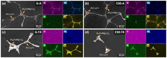 Figure 2 and Table 1 show the EDS elemental mapping analysis of the G- and E30-series specimens in as-cast and heat-treated conditions. Figure 2a,b shows that secondary phases present on the dendritic cell boundaries of the G-A and E30-A specimens are Al7Cu2Fe and Al2(ZnMgCu)3. In Al-Zn-Mg-Cu alloys, solute atoms tend to segregate on dendritic cell boundaries during solidification and form Zn-, Mg- and Cu-rich phases. However, Cu extends its solubility in the Zn-Mg-rich intermetallic phase, i.e., the Al2(ZnMg)3—T phase, changing its composition to Al2(ZnMgCu)3 [35].
