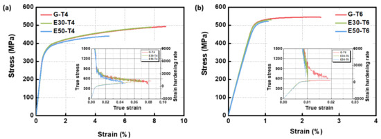 Engineering and true stress–strain and strain-hardening rate curves of the (a) G-T4, E30-T4, and E50-T4 specimens and (b) G-T6, E30-T6, and E50-T6 specimens.