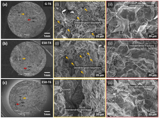 Fractography of the tensile tested (a) G-T6, (b) E50-T4, and (c) E50-T6 specimens. Yellow arrows indicate the intergranular/interdendritic fracture.