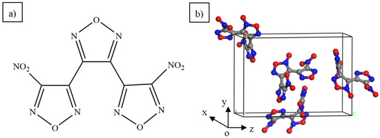 In order to study the change of DNTF structure with pressure, optimization calculation was carried out in the range of 0–80 GPa with step size of 10 GPa. The molecular formula of DNTF is C6N8O8 and its chemical structural formula is shown in Figure 1a. The crystal structure belongs to orthogonal crystal and the space group is P212121 (No.19), as shown in Figure 1b).