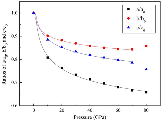The power equation is obtained by curve fitting of the existing data, according to which the influence of pressure on the lattice constant of DNTF can be fully understood. It is noteworthy that the crystal structure changes and the lattice constants (b and c) change abnormally when the pressure is 80 GPa. Therefore, when fitting b/b0 and c/c0 curves, the range of pressure is selected as 0–70 GPa. The fitting curves are shown in Figure 2 and the fitting formulas are as follows: