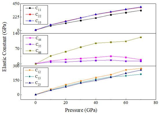 In this work, the elastic constants of DNTF compounds under different pressures are calculated. According to formula (4), it can be judged that DNTF is mechanically stable at 0 GPa, as shown in Table 2. In order to show the influence of pressure on the elastic constant more intuitively, the variation trend of the elastic constant with pressure was plotted, as shown in Figure 3. Based on the previous results of lattice constant, the structure of DNTF changes when the pressure is 80 GPa. Therefore, the influence of pressure on performance in the range of 0–70 GPa is discussed in the following research. As can be seen from Figure 3, C11, C22 and C33 show the same trend of change and their values increase with the enhancement of pressure. With the increase of pressure, the value of C66 is consistent with its change trend, but the trend of C44 and C55 is different. When the pressure is 50 GPa, the values of C44 and C55 reach 35.99 GPa and 17.78GPa, respectively. As the pressure continues to increase, these value decreases. The increase in elastic constants C12, C13 and C23 is the same as the change in the trend of pressure. When the pressure is greater than 50 GPa, the value of C13 increases more slowly than that of C12 and C23.