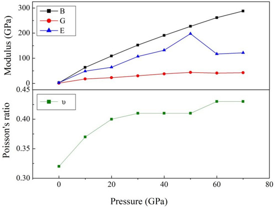 Figure 4 exhibits the pressure dependence of the bulk modulus, shear modulus, Young’s modulus and Poisson’s ratio of the compound DNTF. It is reasonable to conclude that the bulk modulus and shear modulus increase with the rise of pressure. This result suggests that increasing pressure can improve the compressibility and shear resistance of a DNTF compound. When the pressure is less than 50 GPa, the Young’s modulus of the DNTF compound increases. However, when the pressure is greater than 50 GPa, the Young’s modulus decreases. This phenomenon indicates that the stiffness of the DNTF compound is the maximum when the pressure is 50 GPa but it is not beneficial to the increase of compound stiffness when the pressure continues to increase. As the pressure increased from 0 GPa to 70 GPa, the Poisson’s ratio of DNTF compound increases from 0.32 to 0.43. The result shows that increasing pressure can further improve the elasticity and reduce the brittleness of a DNTF compound. When the pressure reaches 30 GPa, the change of Poisson’s ratio becomes gentle and the influence of pressure becomes small.