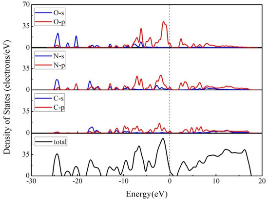 In order to analyze the bonding properties between atoms in DNTF compounds and the effect of pressure on the chemical bonding in the structure, the total density of states (TDOS) and the partial density of states (PDOS) were calculated. The total density of states and the partial density of states at 0 GPa are shown in Figure 5. It can be observed from Figure 5, in the energy range from −8 to 0 eV and the conduction band part, the TDOS mainly comes from the p orbitals of O, N and C atoms. In addition, the TDOS is mainly derived from the s orbitals of O, N and C atoms in the low energy region.