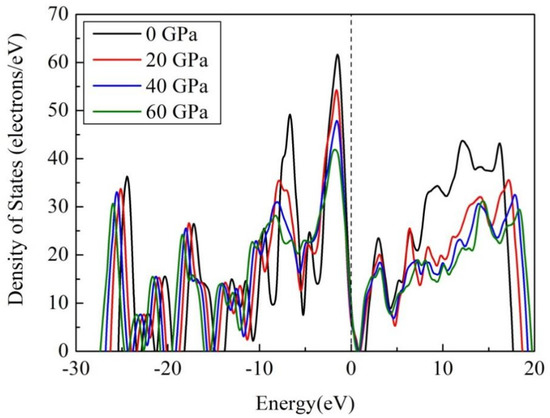 The TDOS under different pressures is shown in Figure 6, from which it can be seen that the curve and trend of the TDOS under different pressures are similar. The results demonstrate that the structure of DNTF is stable and there is no structural change within the studied pressure range. As the pressure increases, the TDOS decreases, which is owing to the change of the interaction potential [28].