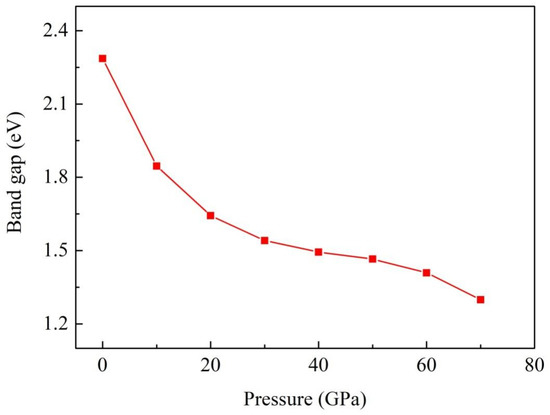 The bandgap is generally the energy difference between the bottom of the conduction band and the top of the valence band. As can be seen from Figure 6, the bandgap gradually decreases with the increase of pressure. In order to observe the change of the bandgap more intuitively, the change of the DNTF bandgap under different pressures is plotted in Figure 7. It can be clearly seen from Figure 7 that the bandgap gradually decreases as the pressure increases. When the pressure reaches 30 GPa, the decreasing trend of the bandgap becomes gentle. As the bandgap decreases, the electron more easily transitions from the valence band to the conduction band. This makes the material more likely to disintegrate and explode [29]. Therefore, it can be concluded that with the increase of pressure, DNTF is easier to decompose and its structure is more unstable.