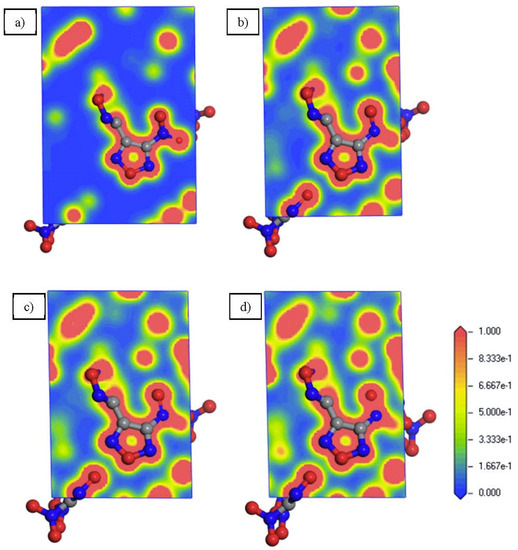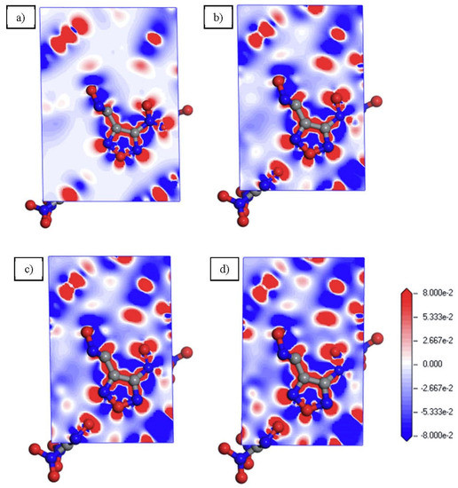 The electron density difference represents the gain and loss of electrons in a DNTF compound. The electron density difference of DNTF under different pressures is shown in Figure 9 and the plot range is −0.8–0.8 e/Å3. In this figure, red means getting electrons and blue means losing electrons. In DNTF compounds, C atoms gain electrons and there is a shared electron between C-C bonds. With the increase of pressure, the degree of electron gain and loss does not change obviously. The degree of electron aggregation around N and O atoms increases. It leads to the further polarization of atomic binding bonds in DNTF compounds, which promotes the impact sensitivity of DNTF.