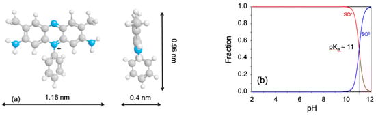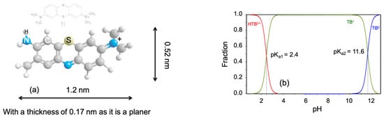 The TB (also called basic blue) has a CAS number of 92-31-9. It is in the chloride form with a molecular weight of 305.82 g/mol and a solubility of 30 g/L (Acros). The reported pKa values are 2.4 and 11.6 [29]. It is in a planner form with a length of 1.07 nm and a width of 0.40 nm (Figure 1). The SO used is also in the chloride form with a CAS number of 477-73-6, a molecular weight of 350.84 g/mol, a solubility of 50 g/L [30], and a pKa value of 11 [31]. In terms of molecular size, it is 1.16 nm long by 0.96 nm wide by 0.4 nm thick, due to the twisting of the benzene ring (Figure 2).