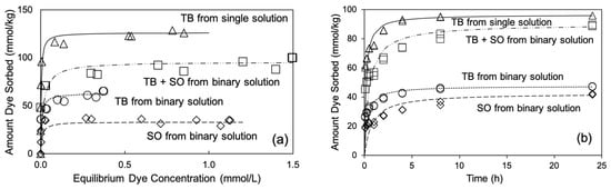 so that the parameters can be determined by linear fitting. In these equations, k (kg/mmol-h) and (mmol/kg-h) are the rate constants and initial rates of dye sorption on ZEO, qt and qe (mmol/kg) are the amounts of dye sorbed at time t and at equilibrium. The fitted qe values were 48 and 43 mmol/kg for TB and SO sorption from a binary solution of equal concentrations, with the coefficient of determination r2 greater than 0.995. The initial rates and the rate constants for TB and SO sorption on ZEO were 164 and 54 mmol/kg h, and 0.07 and 0.03 kg/mmol-h, respectively. In comparison, the qe values were 96 and 76 mmol/kg; the k values were 0.1 and 0.04 kg/mmol-h; and the values were 595 and 213 mmol/kg h for TB and SO sorption from a single solution (Table 1). The high-rate constant and larger qe value for TB sorption was again confirmed by the isotherm study and suggested a better affinity of TB for ZEO surfaces in comparison to SO. Previous results showed that the k and qe values were about 200 g/mol-s and 90 mmol/kg for TB sorption on a clinoptilolite zeolite [20] and the k and qe values were 0.56 g/mg min and 24.9 mg/g for TB sorption on bentonite [2].