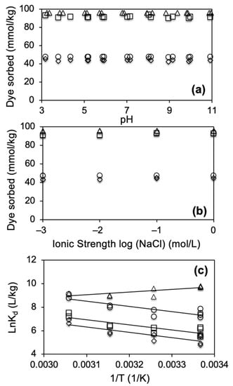 Influence of equilibrium solution pH (a), ionic strength (b), and temperature (c) on dye sorption. See Figure 3 for symbol legends.