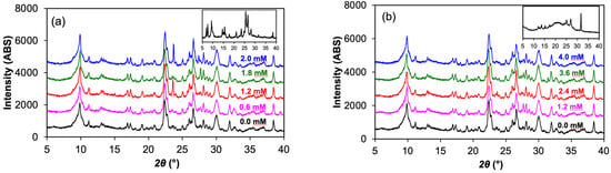 XRD patterns of ZEO after sorption from binary (a) and single TB (b) solution of different initial concentrations. The insets are the XRD patterns of solid SO (a) and TB (b).