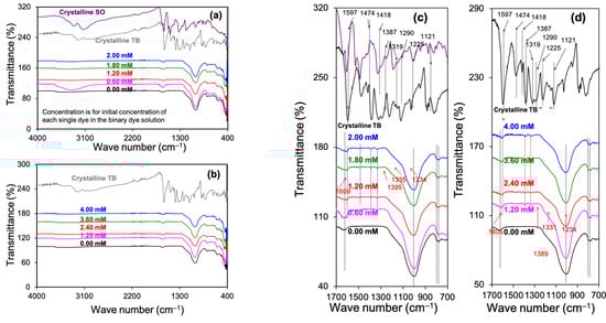 FTIR spectra of ZEO after dye sorption from binary (a) and single TB (b) solutions of different initial concentrations and their enlargement (c,d) in the wave numbers of 700–1700 cm−1.