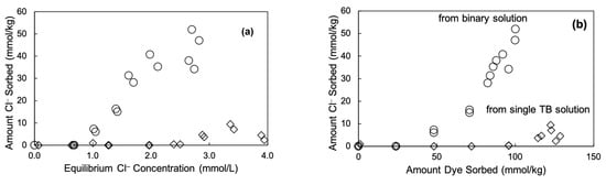 Sorption of counterion Cl− from single and mixed dye solutions: (a), and amount of Cl− sorbed vs. dye sorbed (b).