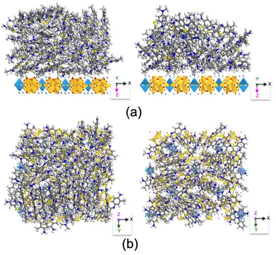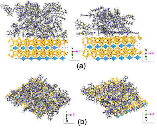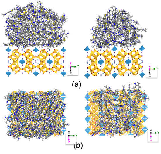 The results from the molecular dynamic simulation showed the extensive TB molecules aggregation on the surfaces of ZEO at the TB sorption capacity of 126 mmol/kg along different crystallographic directions or different crystal faces (Figure 8, Figure 9 and Figure 10). Similarly, at the TB + SO sorption capacity of 96 mmol/kg, both TB and SO molecules formed aggregates on ZEO surfaces (Figure 8, Figure 9 and Figure 10), confirming the simultaneous uptake of Cl− at high SO loading levels, revealed by the IC study. The clips of the simulation dynamics can be found in the supporting documents. These results suggested that the admicelles of dye are the final dye surface configuration are caused by the large ECEC value and limited external SSA value of ZEO.