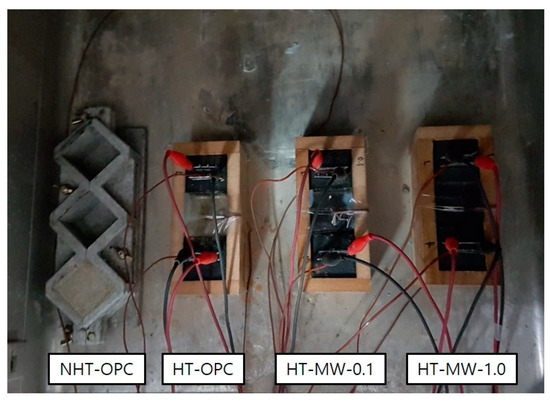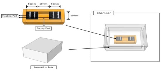 The heat curing experiment was performed by adjusting the ambient temperature in the chamber. The properties of the chambers used are listed in Table 2. To simulate the actual concrete curing environment, the specimen was covered by an insulation box built in advance. A voltage was supplied for 4 h by connecting a power supply (EX-200) to the electrode installed in the MWCNT cementitious composites of the heating parts. The internal temperatures of the cementitious composites of the heating and curing parts were measured by connecting the thermocouple inserted at the center of the specimen to a static data logger (TDS-303). The specimens were placed inside the chamber, as shown in Figure 4.