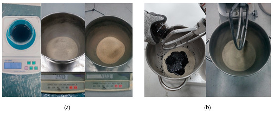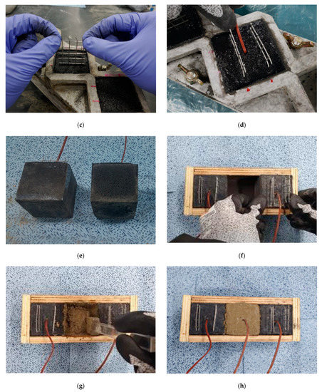 Fabrication process of the test specimens. (a) Measuring. (b) Mixing (3 min). (c) Installing a stainless-steel mesh. (d) Installing a thermocouple in the heating part. (e) Curing of the heating part (91 d). (f) Installing the heating part. (g) Tamping of the curing part. (h) Installing a thermocouple in the curing part.