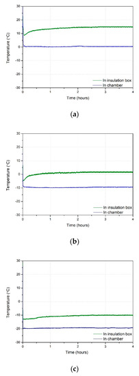 Temperature versus time at a chamber temperature of (a) 0 °C, (b) 10 °C, and (c) 20 °C inside and outside the insulation box.