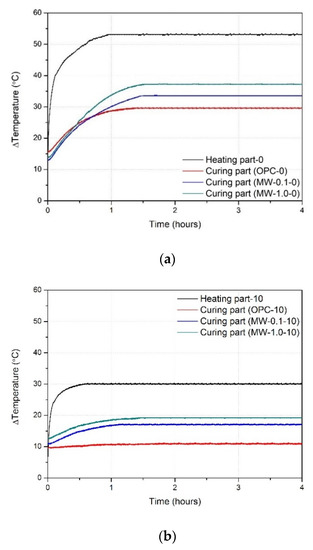 - The installation of an insulation box increased the maximum temperature change of the curing part of the MWCNT cementitious mortar composite. The insulation box created an environment similar to a closed system, in which heat generated in the heating part circulated, causing the internal temperature to increase. The temperature on the surface of the cementitious mortar composite also increased, which further increased the heating temperature of the heating part of the MWCNT cementitious mortar composite. Consequently, the maximum temperature change in the cementitious composite of the curing part increased.
