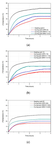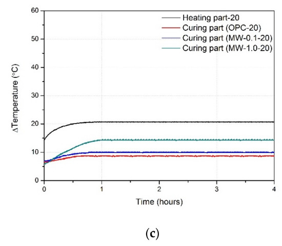 Figure 7 shows the internal temperature graphs of the heating and curing parts of the MWCNT cementitious composite specimens during heat curing with the insulation box at ambient temperatures of 0 °C, −10 °C, and −20 °C. The internal temperature of the heating part increased by 50.2 °C, 40.4 °C, and 32.4 °C when curing at ambient temperatures of 0 °C, −10 °C, and −20 °C, respectively. The internal temperatures of the curing part of the OPC, 0.1 wt% MWCNT cementitious composite, and 1.0 wt% MWCNT cementitious composite increased as follows: by 30.8 °C, 35.0 °C, and 40.8 °C at an ambient temperature of 0 °C; 20.0 °C, 25.8 °C, and 30.7 °C at an ambient temperature of −10 °C; and 16.7 °C, 20.4 °C, and 24.1 °C at an ambient temperature of −20 °C. Compared with the case without the insulation box, the internal temperature changes of the curing part of the OPC, 0.1 wt% MWCNT cementitious composite, and 1.0 wt% MWCNT cementitious composite increased by 5.1%, 7.7%, and 9.4% at an ambient temperature of 0 °C; 81.8%, 51.8%, and 59.1%% at an ambient temperature of −10 °C; and 92.0%, 104.0%, and 68.5%% at an ambient temperature of −20 °C. The installation of the insulation box created an environment similar to a closed system with no heat loss. The temperature change inside the insulation box increased, because the insulation box increased the heating effect of the heat generated in the heating part of the MWCNT cementitious composite (Figure 5). The increased internal temperature of the specimen increased the surface temperature, which, in turn, increased the heating temperature of the heating part of the MWCNT cementitious composite. Consequently, the internal temperature increase of the cementitious composite in the curing part was enhanced.
