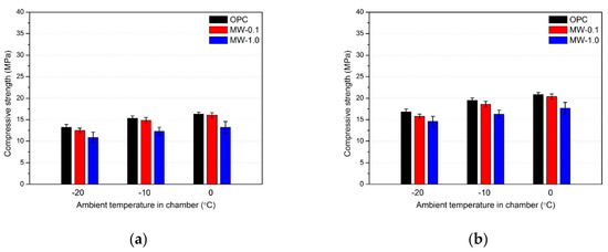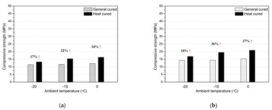 Table 3 summarizes the results of the compressive strength test for the curing specimen. The specimen was cured in the chamber for 7 and 28 d. Figure 8 shows a graph of the compressive strength improvement effect of the heat-cured curing part of the OPC. Figure 8a,b shows the results of the compressive strengths of the cement mortar 7 and 28 d after heat curing, respectively. The strengths of the heat-cured specimens were 13.3 MPa, 15.3 MPa, and 16.3 MPa for the 7-d compressive strength test and 16.8 MPa, 19.5 MPa, and 20.9 MPa for the 28-d compressive strength test at ambient temperatures of −10 °C, −20 °C, and 0 °C, respectively. As the ambient temperature increased, the compressive strength also increased. Heat curing resulted in an increase in the compressive strength by 17%, 32%, and 34% for the 7-d test and by 18%, 36%, and 37% for the 28-d test at ambient temperatures of −10 °C, −20 °C, and 0 °C, respectively. The compressive strength improvement effect of heat curing was the lowest at an ambient temperature of −20 °C. The heating temperature of the heating part of the MWCNT cementitious composite increased with the increasing ambient temperature. At sub-zero temperatures, the compressive strength of the heat-cured specimen was higher than that of the specimen that was not heat-cured. Hydration does not occur in a specimen exposed to sub-zero temperatures because of the freezing of internal moisture, which leads to the expansion of the pores inside the specimen. By contrast, the internal temperature of the heat-cured specimen was maintained at 8 °C or higher, and the moisture was not frozen, thus improving the compressive strength.