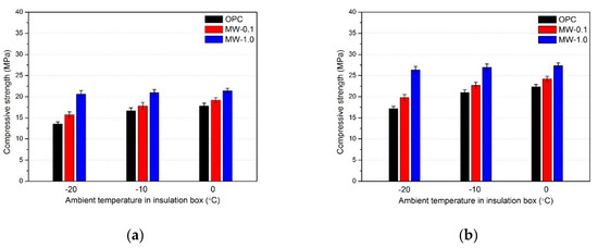 Compressive strength of the specimens without the insulation box after (a) 7 days and (b) 28 days.