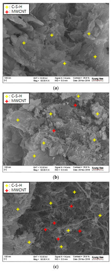 Figure 11 shows the results of the FE-SEM analysis of the MWCNT cementitious composites, according to the MWCNT content. The yellow crosses indicate C–S–H (calcium–silicate–hydrate), and the red crosses indicate MWCNTs. Figure 11a shows the internal structure of the OPC without MWCNTs, and many pores were generated among the cement hydrates.