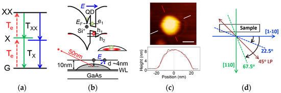 - Treu, J.; Schneider, C.; Huggenberger, A.; Braun, T.; Reitzenstein, S.; Höfling, S.; Kamp, M. Substrate orientation dependent fine structure splitting of symmetric In(Ga)As/GaAs quantum dots. Appl. Phys. Lett. 2012, 101, 022102. [Google Scholar] [CrossRef]