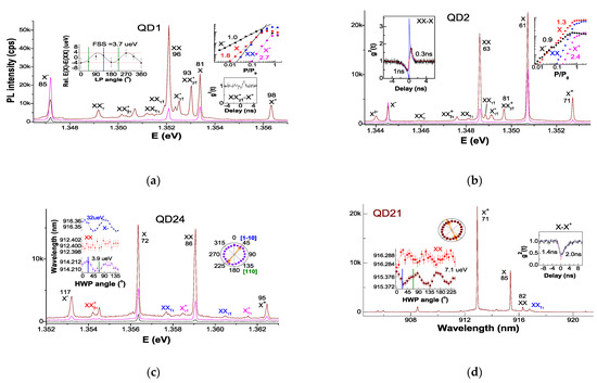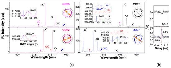 Figure 2 presents the QDs with D3h symmetric exciton emissions in a spectral feature as pyramidal (111) QDs [16,17] from valence band mixing and lh h2 for e1-h2 transitions XX2ī+, X1ī+ and XX1ī and e1-h1 ones , Xī1+ and XXī1 (indexes mean the hole numbers in h1 (first) and h2 (second) with a bar classifying the transitions) [16,33], located around XX as a mirror. XX2ī+ singlet built a cascade with X+ as the bunching peak in their cross-correlation reflects, weaker than before [33] due to a fast electron capture in X+ to populate XX; X1ī+ doublet (split by Δhh ± (ΔIeh + ΔIIeh): 150 μeV in QD1 or 50 μeV in QD2) and XX1ī doublet (split by Δhh−Δ0eh [16] of near zero); a broad XXT- (doublet split by ~Δ0eh/2 [33]) also appeared. In QD1, the three peaks in XXī1 were well depicted by D3h transition diagram (σ-polarized) while the three peaks in with the branch appearing to reflect C3v [16], the lack of a mirror symmetry; in QD2, both and XXī1 showed one peak from D3h (z-polarized) [16]. In QD24, the higher field showed a relatively lower emission intensity and made these peaks a little far from XX that has a negative binding energy. QD5 in Supplementary Materials (SM) shows more D3h exciton emissions while the QDs in a high electric field, e.g., QD21 and QDs in Figure 3 and Figure 4a, only show e1-h2 ones, XX2ī+ singlet located between X and XX, XX1ī doublet split by Δhh−Δ0eh of 70 μeV and X1ī+ doublet far from XX, from a large h1−h2 energy offset in the field. For epitaxial QDs with a less lateral confinement, the eh separation and Stark shift in the lateral direction to tune FSS requires a relatively lower electric field [36]. The appearance of the D3h symmetric excitons reflects a vertical field for eh separation along [001] for higher exciton symmetry; the FSS, varying from dot to dot, e.g., QD4 in SM with similar spectral features and a high XX as QD1 but FSS of 11 μeV, is from an in-plane field projection as a perturbation; the FSS is also reported in pyramidal QDs from composition alloy or piezoelectric potential [15]. For QD1 and QD2, the Si dopant filled two electrons in QD e1 (Fermi level pin), resulting in the first appearance of X−(slope: 1.0 or 0.9) before X under weak excitation (black line), a higher slope for X (1.8 or 1.3) and an effective XX population under high excitation (wine line) in the slope of 2.4~2.7, the same as X+ (2h capture); QD1 had a higher total intensity and a relatively higher XX saturated intensity (50 kcps), reflecting a fluent electron capture due to electron level coupling by tunneling that also broadens the spectral line. The line-shape of each spectral line is a Gaussian envelope with different linewidths, broadened by 10~70 μeV after subtracting the spectrometer resolution, and tails in the lower-energy side reflecting wavefunction tunneling into the barrier, in spite of a natural radiative linewidth of a few ueV in a Lorentzian line-shape. The spectral diffusion from fluctuating charges >50 nm from a QD leads to a linewidth broadening ~15 μeV (Stark shift slope of ~50 μeV/(kV/cm) [18]); the rest broadening of 0~60 μeV is from electron tunneling and wavefunction coupling between QD e1 and Rydberg level at the Si dopant. In QD2, XX2ī+ (linewidth: 81 μeV) with respect to X+ (71 μeV), X (61 μeV), XX (63 μeV) and X− (62 μeV) reflected no electron tunneling broadening; in QD1, XX2ī+ (93 μeV) with respect to X+ (98 μeV), X (81 μeV), XX (96 μeV) and X− (85 μeV) reflected an electron tunneling broadening of ~45 μeV for XX and X+ that showed the same linewidth (similar for QD4 in SM). As a result, in QD1 and QD4, the XX population at saturation was greatly enhanced. The QDs in Figure 4a also showed the first appearance of X−, a relatively higher XX and LX clockwise rotate from [1–10] related to a lateral field projection. In contrast, for QD24, the Si dopant built a strong vertical field for small FSS of 3.9 μeV in X; electron level coupling in the field induces abnormal FSS, zero in XX and 32 μeV in X− and X+, a less electron tunneling broadening of ~16 μeV for XX (linewidth: 86 μeV) and X− (117 μeV) after subtracting its FSS, but zero for X+ (95 μeV) after subtracting its FSS due to its greatly lower field (2h in QD and 1e at Si dopant) and the first appearance of X under weak excitation. Mostly, a QD in a vertical field with little tunneling shows a dominant X+ and a weak XX (e.g., QD21), with the same FSS for X and XX. The XX–X cross-correlation in QD2 shows an asymmetric profile, with characteristic times for the antibunching dip of 1 ns (i.e., 2Te for XX population and Te = 0.5 ns for X) and the bunching peak of T1 ~0.3 ns, i.e., intrinsic X radiative lifetime, the XX repopulation (i.e., the upper Te in Figure 1a) therefore competes with the cascade emission. The bunching peak remains if XX has tunneling (zero FSS) while it disappears if X has tunneling (zero FSS), see QD26 and QD27 in Figure 3. An asymmetric antibunching profile is shown in X–X+ cross-correlation in QD21 with the fitting times 1.4 ns reflecting slow electron capture and 2.0 ns reflecting X+ (1e2h) population. The different correlation profiles help to identify the dominant X, X+ or XX peak.