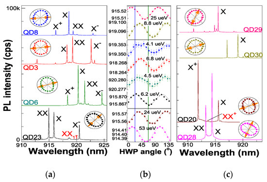 - Seidl, S.; Gerardot, B.; Dalgarno, P.; Kowalik, K.; Holleitner, A.W.; Petroff, P.M.; Karrai, K.; Warburton, R.J. Statistics of quantum dot exciton fine structure splittings and their polarization orientations. Phys. E Low-Dimens. Syst. Nanostruct. 2008, 40, 2153–2155. [Google Scholar] [CrossRef]
