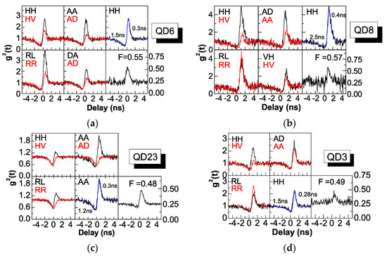 Polarization-resolved XX–X cross-correlations in (a) QD6, (b) QD8, (c) QD23, and (d) QD3. The estimated F, the convoluted fitting (blue) and the fitting times are given.